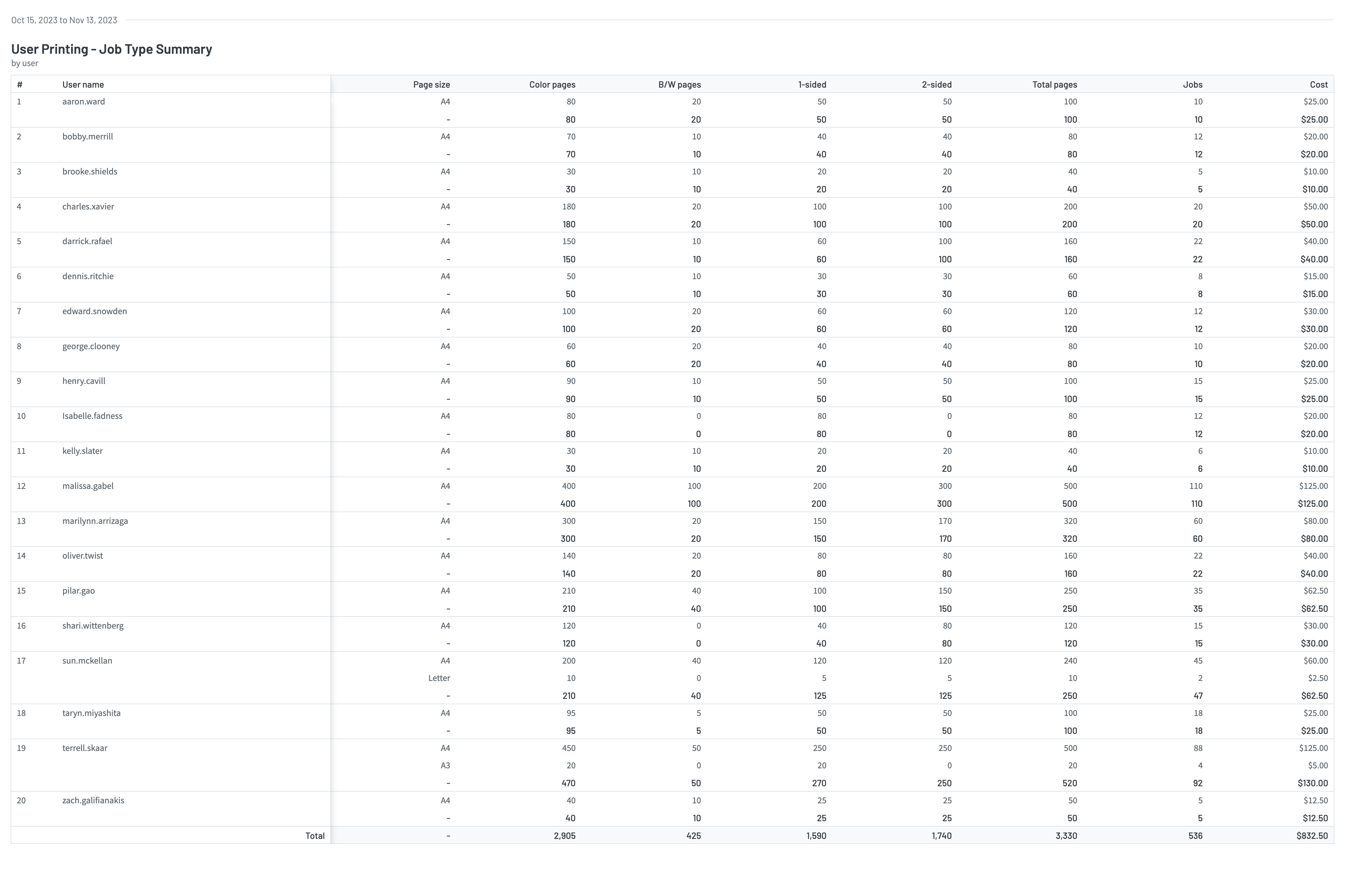 User Printing - Job Type Summary Quickly view all of your active users' print job type summary.